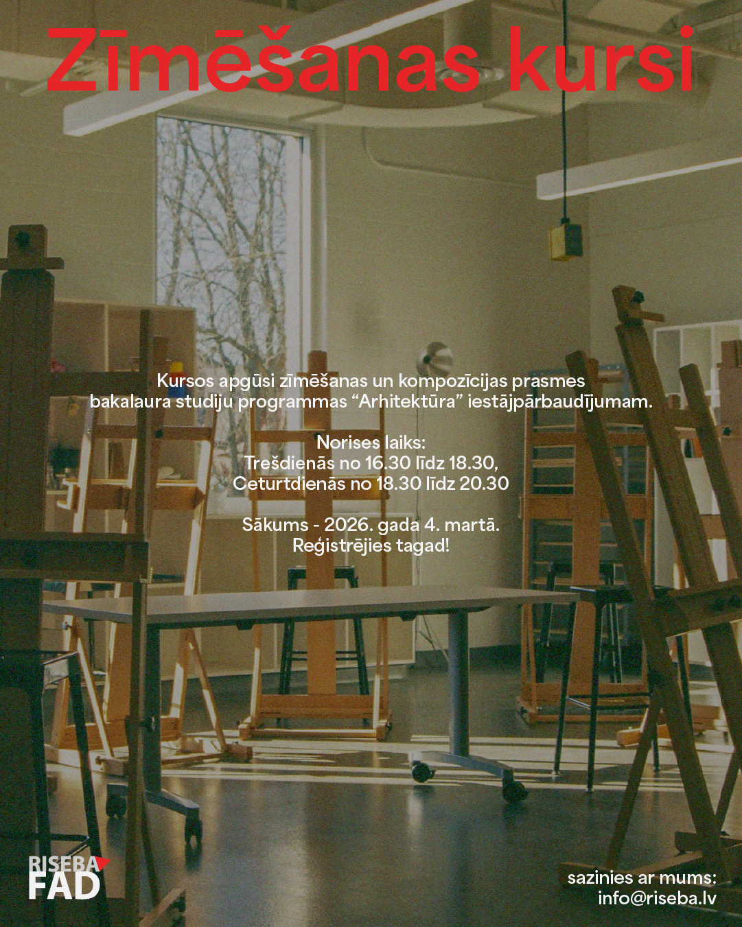 Attīsti savas zīmēšanas un kompozīcijas prasmes, gatavojoties bakalauru studiju programmas “Arhitektūra” iestājpārbaudījumam. Nodarbības vada Mg.Art. Laura Potaša-Strode un to sākums - 2026. gada 4. martā.